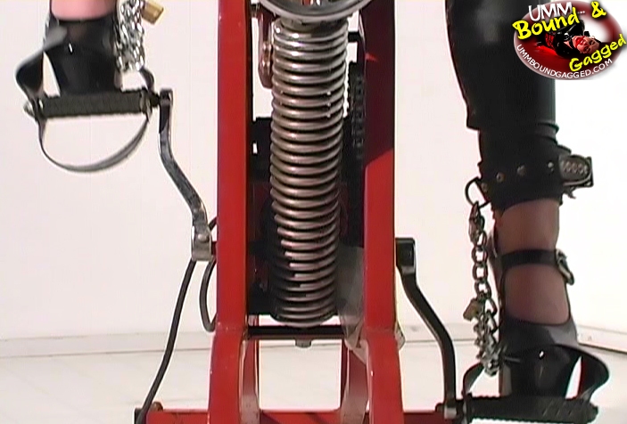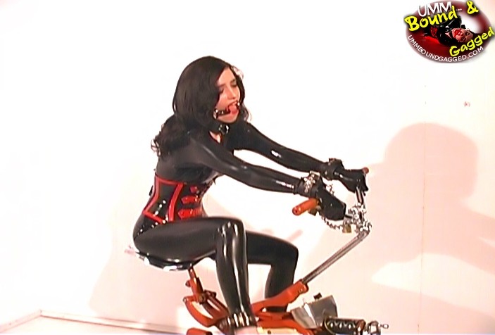 Brunette slave girl in latex, being chained, gets a breath control session